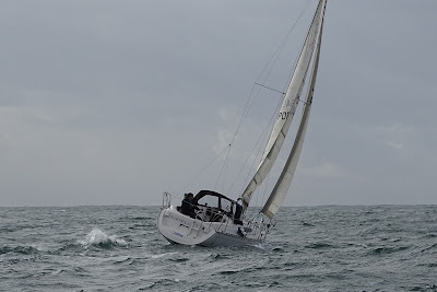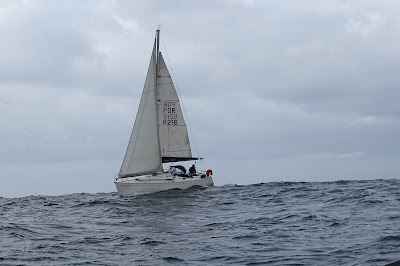 Bogavante, Koi e BSerious resolveram ir lá "fora" para ver como estavam as modas... 2 horas de excelente navegação percorrendo cerca de 11 milhas às "voltas", com algumas "atravessadelas no topo da vagas maiores onde o vento acelerava, apesar da grande já com o 1º rizo a genoa já um pouco enrolada. A bordo do Bogavante surfs acima 10 nós aconteciam, uma vez acima dos 11 e outra o GPS marcou 12,1... 5 estrelas!