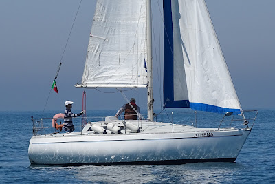 Percurso à vela foi curto pois o vento mais não deixou... de tal modo que nem ao Douro se conseguiu chegar. E para o regresso ao local combinado para a "merenda" ao largo da Praia de Matosinhos, aos bons serviços do vento do porão se teve que apelar.