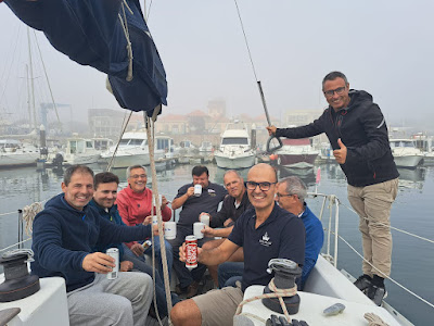 Mas tudo seria mais triste nesses tempos se não se tivesse mantido as saídas para o mar nos intervalos dos confinamentos sem ajuntamentos, e se este grupo de amigos não tivesse mantido o contacto diário no grupo do Whatsapp, onde forma continuada se trocam mensagens, brincadeiras, informações sobre veleiros, dúvidas, pedidos de ajuda de soluções, se combinam saídas para o mar, fotografias das saídas, almoços, os percursos à vela, ponto de situação e ajuda nas amarrações das embarcações dos amigos em dias de temporal, acompanhamento de navegações dos amigos como uma recente viagem do Algarve para Leixões em que durante 3 dias o acompanhamento à distância se fez around the clock..., etc.
