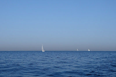 E como a "largada" é sempre no canal de saída do porto, aí e no momento certo, apareceu um sudeste que "empurrou" as graciosas naus a caminho do fim do mundo... 10, 12 nós de vento, mar chão, sol, calor, um dia dum verão que não se quer ir embora... E para sul se partiu com rumo para o fim do mundo (boia em frente da praia da Madalena a cerca de 3,5 NM de Leixões)! Fim do mundo que desta vez se mostrou inacessível por vontade divina pois a cerca de 0,5 NM o vento caiu... Parecia que os deuses só nos queriam proporcionar um campo bem limitado de vento entre a praia de Matosinhos e a barra do Douro, e sendo assim o melhor era não contrariar a sua vontade... Rumo voltou para norte quase até ao ponto de partida, e depois para sul outra vez... E nestas andanças de mareação entre o norte e o sul, o tempo foi passando até à hora de regressar para o tradicional convívio à volta da mesa. E mais uma vez os deuses estavam atentos... era hora de almoço e o vento não era preciso para nada...